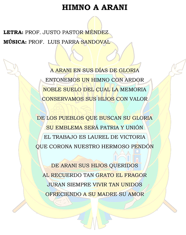 El Escudo de Arani fue creado en 1980, por el Prof. Gualberto Soto, posteriormente en 1989 durante la gestión del Prof. Juvenal Herbas Carrillo, Alcalde del Municipio y por iniciativa de la Junta Municipal a la cabeza del Dr. Antonio Rojas G. (Presidente), Prof. Nicolas Zapata G. (Vice Presidente), Prof. Indalicio García R. (Secretario) y los Munícipes; Wilfredo Rojas B., Sr. Ramon Villarroel C., y Prof. Félix Vargas C., el escudo sufrió modificaciones en ciertos elementos, el mas relevante es la bandera que se encuentra alrededor del mismo, en principio estaba la bandera nacional y fue sustituida por la bandera de Arani. A continuación, se describe el actual escudo del Municipio de Arani.